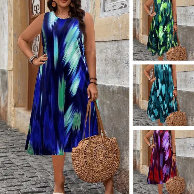 Upptäck sommarens ultimata komfort och stil med denna luftiga klänning i plus size. Med sin figurnära överdel, flödande kjol och turkos och vit färgblockdesign är den ett perfekt val för allt från semester till strandutflykter.