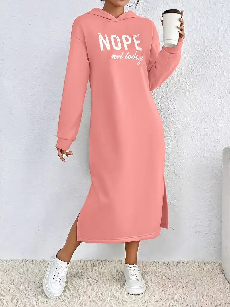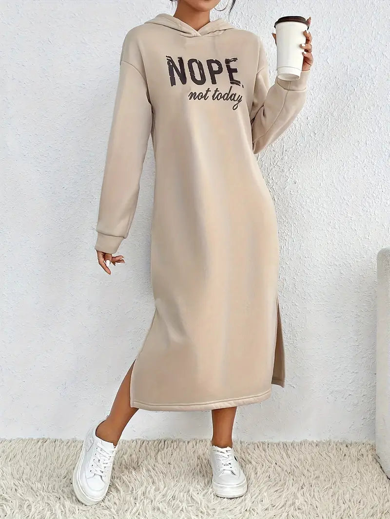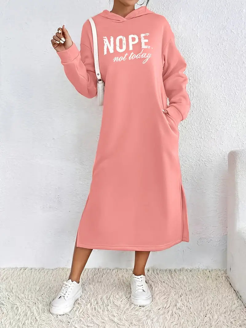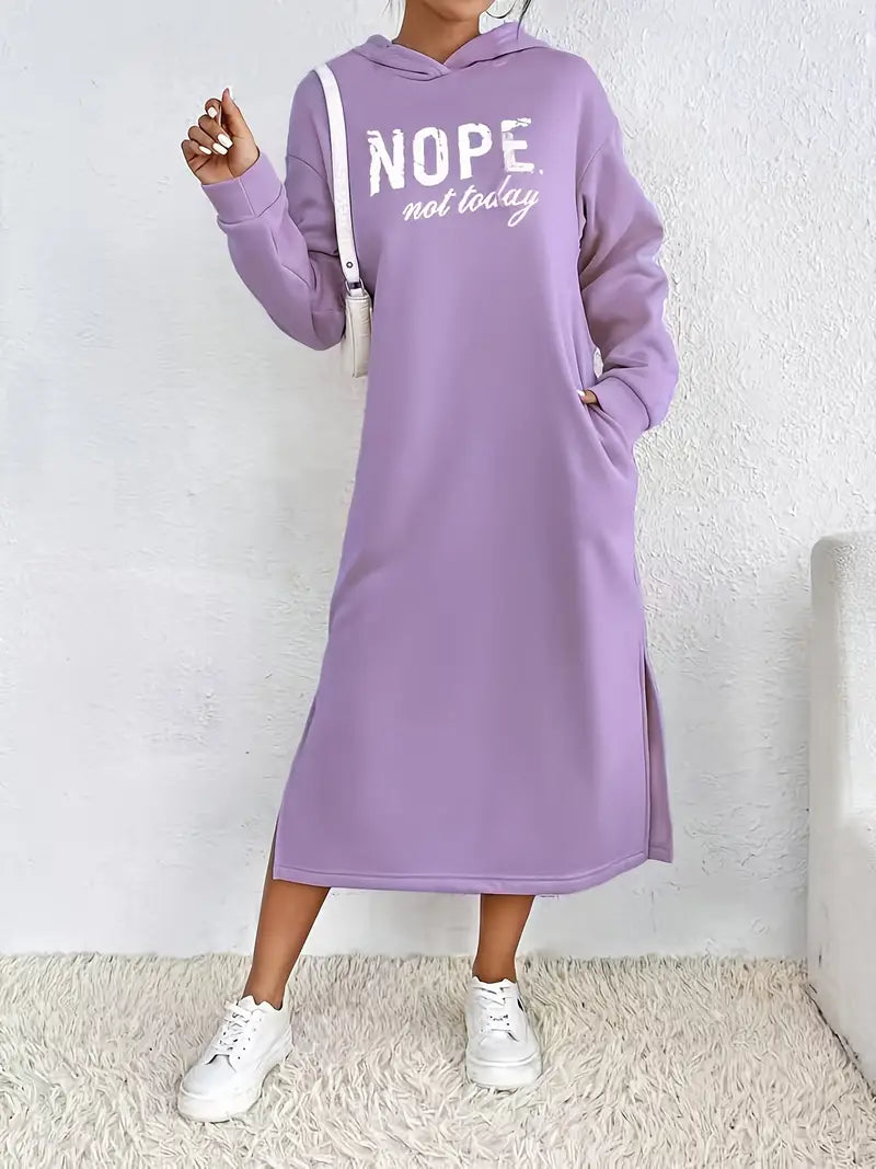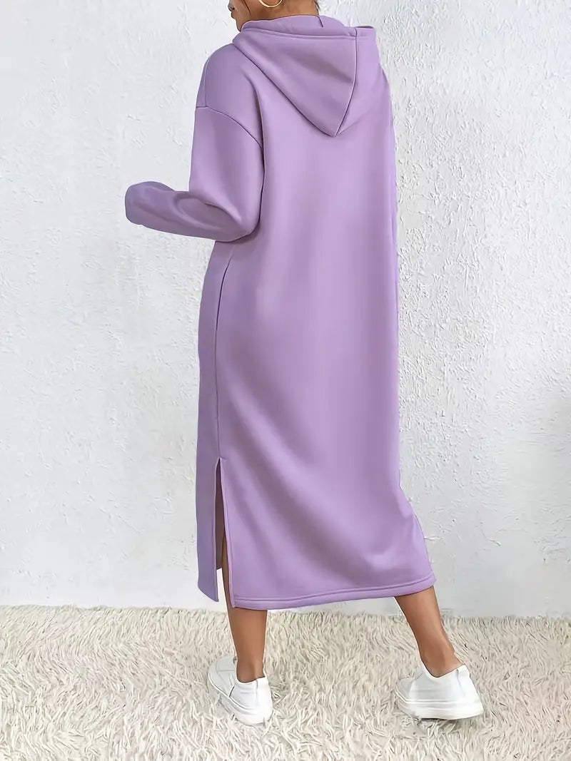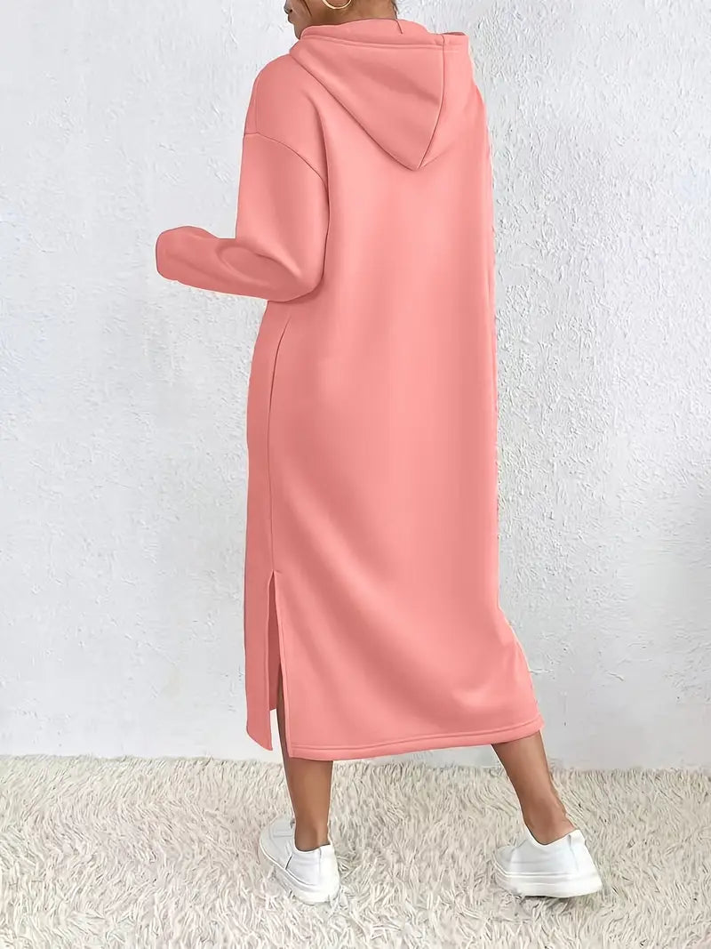 Letar du efter en klänning som kombinerar komfort och stil? Denna långa huvklänning ger dig en avslappnad och modern look med sin mjuka passform och praktiska huva – perfekt för både hemmadagar och promenader i staden.