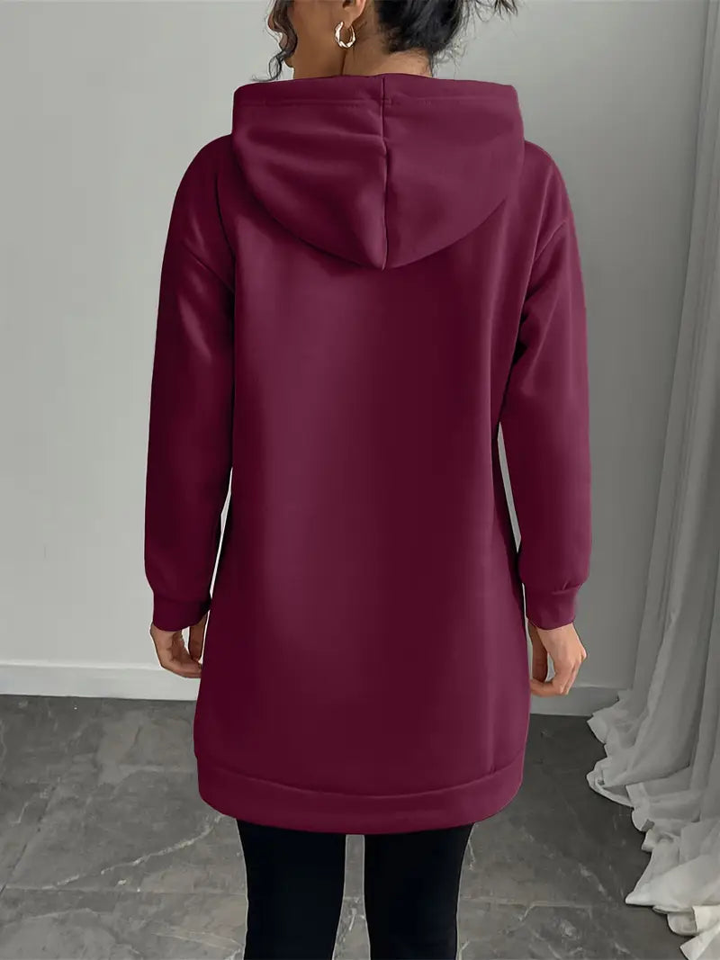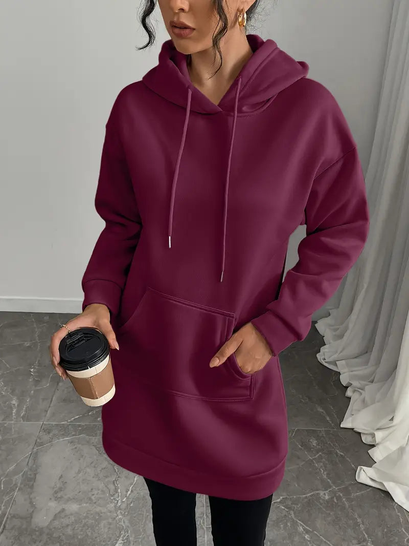 Vill du ha en klänning som är både bekväm och trendigt avslappnad? Denna huvklänning kombinerar mjuk komfort med praktiska detaljer som en framficka och huva – perfekt för vardagens alla tillfällen.
