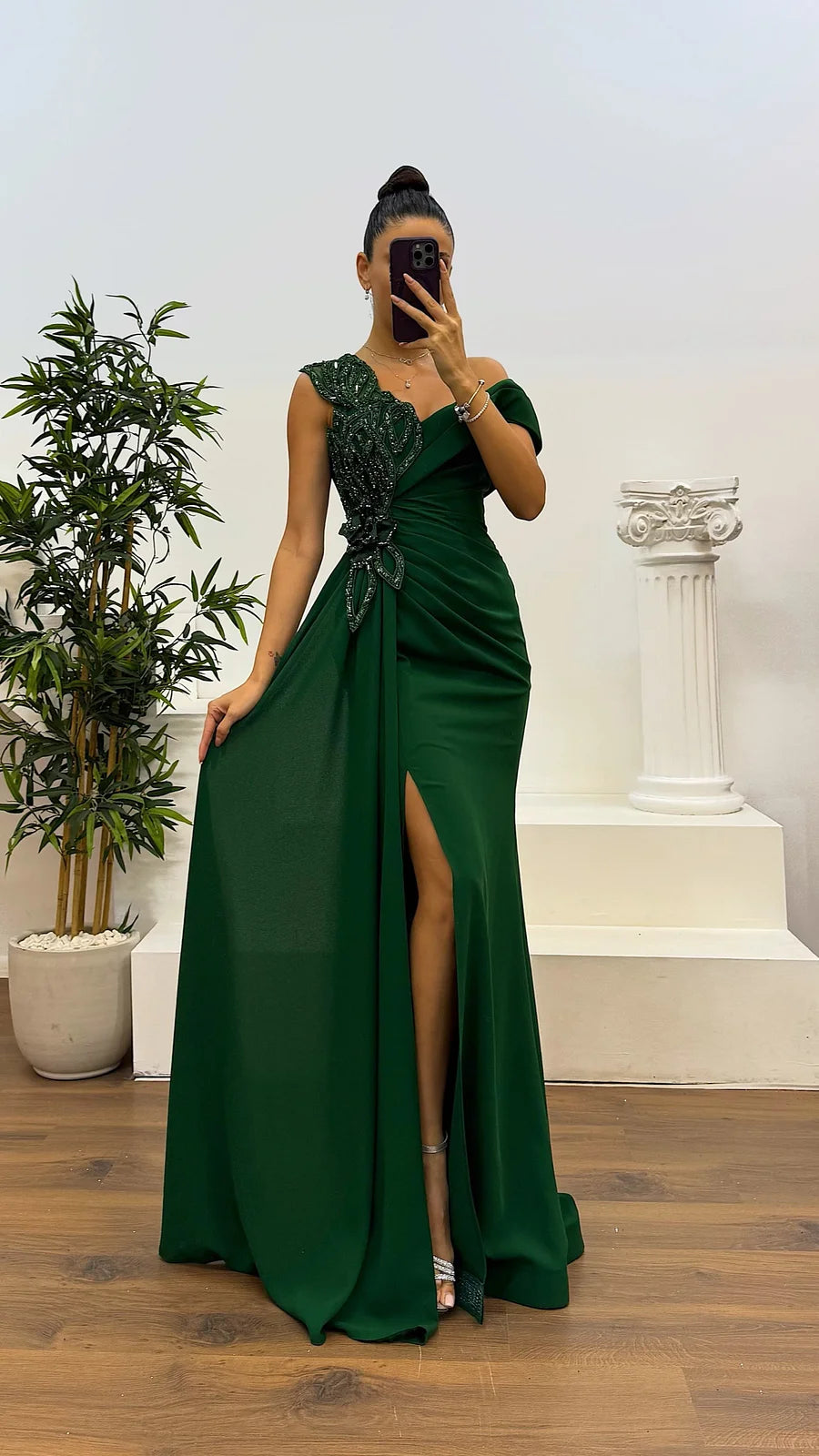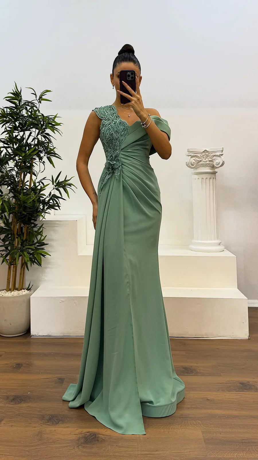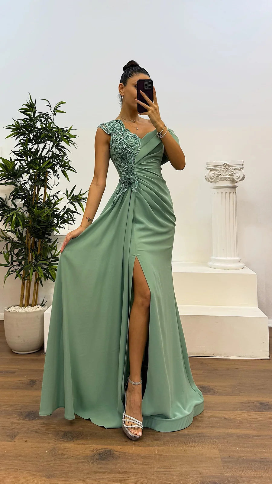 Gör ett slående intryck med Valeria™ - Plisserad Aftonklänning, designad med en sofistikerad one-shoulder skärning och en djärv slits i sidan. Den flytande silhuetten framhäver din figur samtidigt som den ger komfort – perfekt för alla speciella tillfällen.